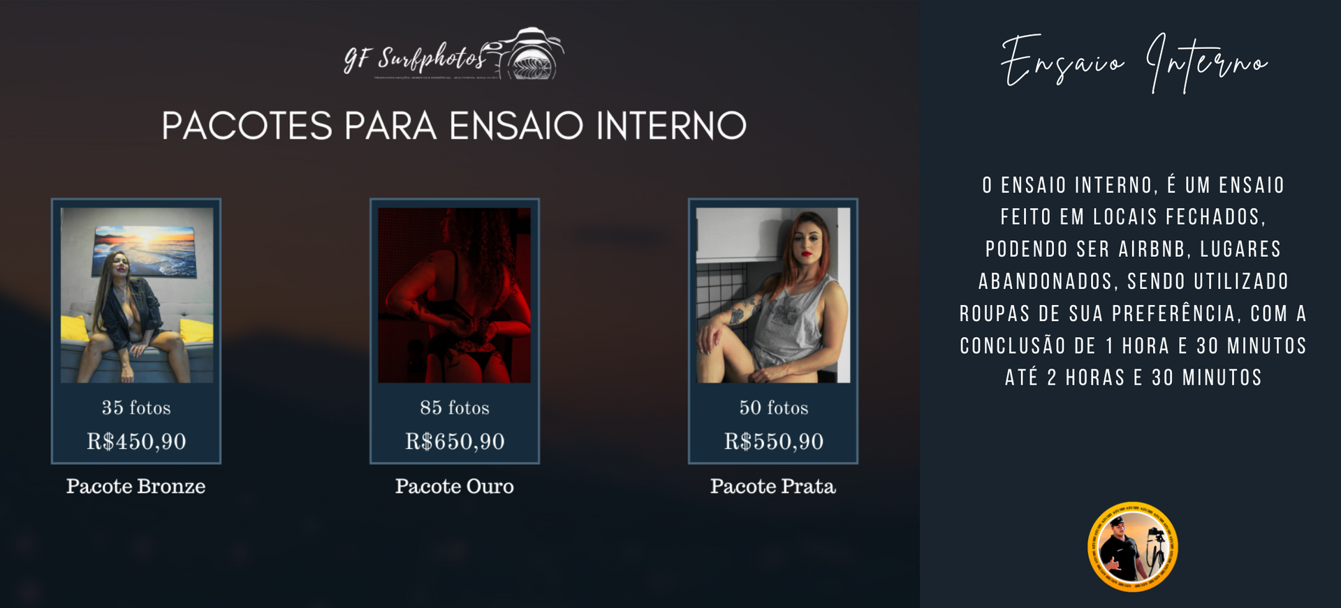 "Gabriel foi um querido desde o nosso primeiro contato, tive alguns problemas pessoais que fizeram com que eu adiasse as sessões algumas vezes, e ele foi muito compreensivo e empático, em todos os momentos. A sessão foi super leve, e descontraída o que pra mim foi muito importante devido ao momento que estou passando. Além disso ele conduzio a sessão perfeitamente, sendo sempre muito profissional, os resultados disso tudo estão nas fotos, ME ACHEI LINDA! Pra fechar com chave de ouro recebi as fotos tratadas muitooo rápidamente. Só gratidão, valeu super a pena acordar 4am, recomendo de olhos fechados!"